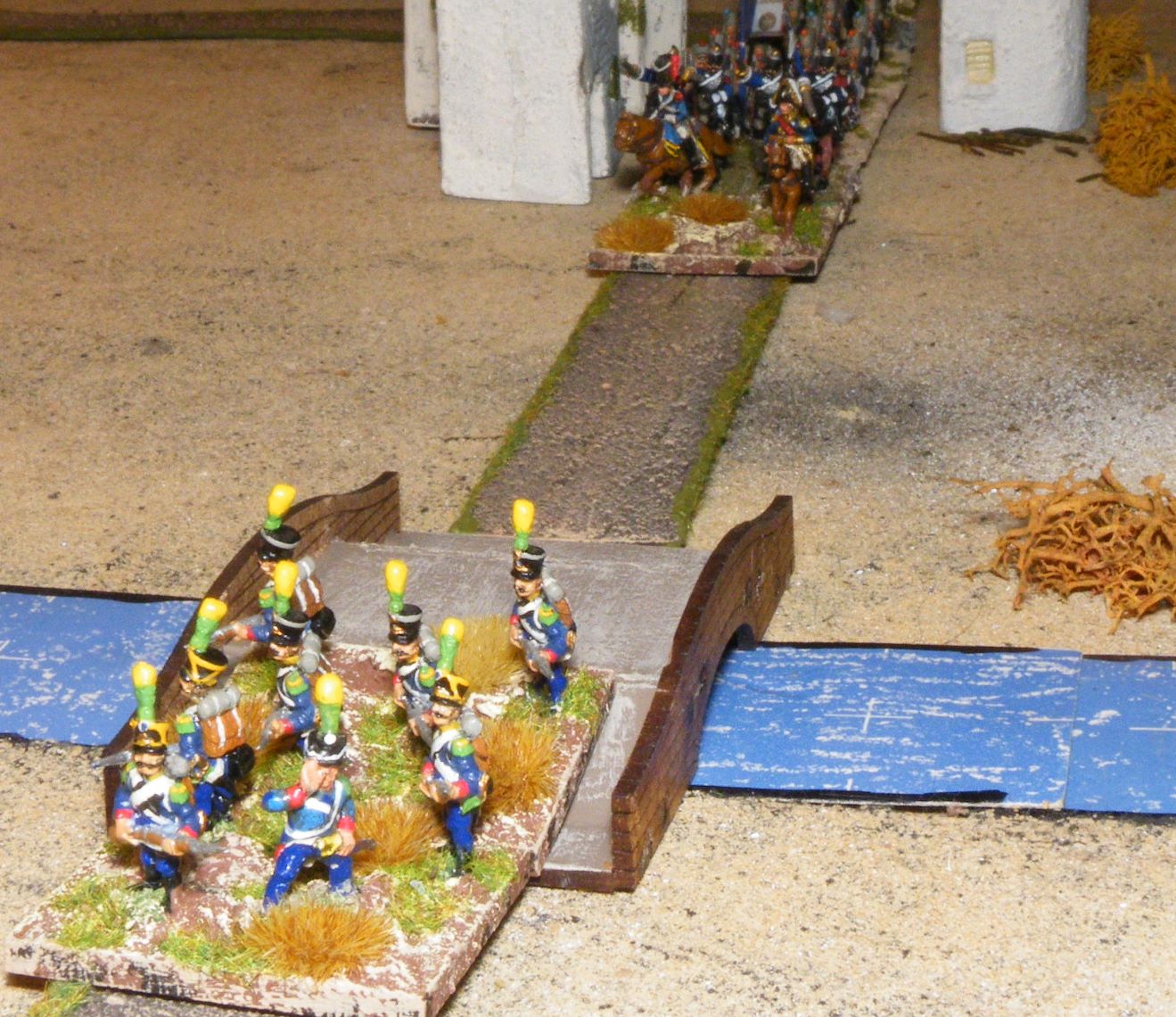 This battle would be different due to my opponent. Back in June I went to the Durham Wargames Show, a good day all round with loads of bargains at the Bring n Buy. Also I bumped into an old school chum, SPAV, who turns out to be a Napoleonics nut. Anyway we kept in touch & a game set up. SPAV has never played DBN before but he soon picked up the rules. A Sunday afternoon was put aside & this game the result. SPAV took ze French & yours truly the Allies. Ze French went first & marched along the Penedo town road, The Allies would arrive on the Runa road. It would be a race for the bridges!